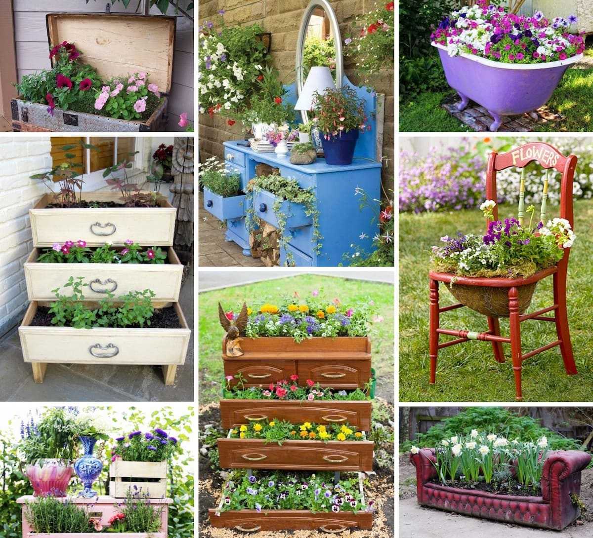 Из мебели. Не потребуется дополнительно сооружать декоративные заборчики, если высадить цветы в выдвинутые ящички комода или поместить клумбу внутри деревянной кровати. Вариантов креативного подхода существует много, стоит только проявить фантазию и смекалку.