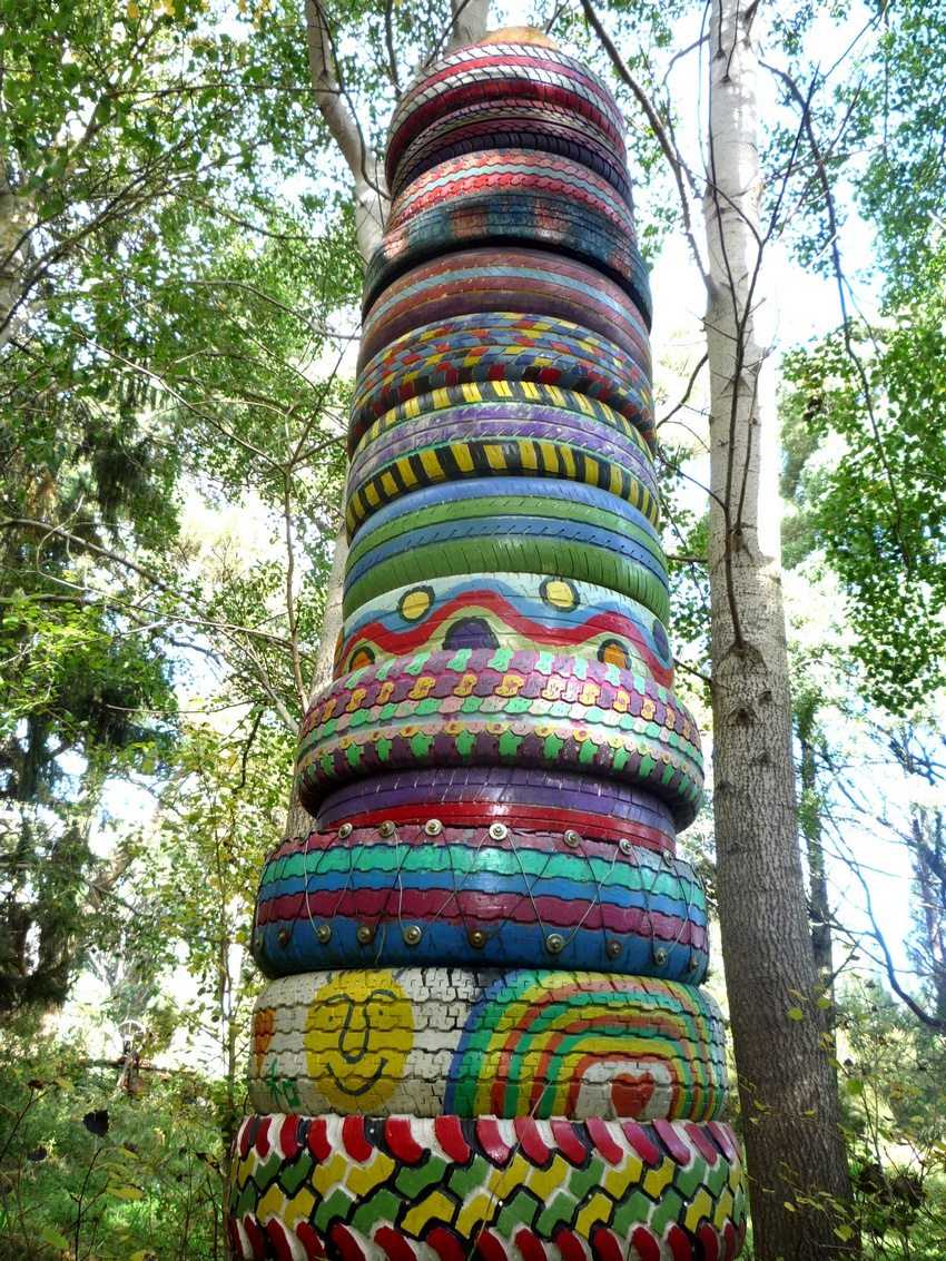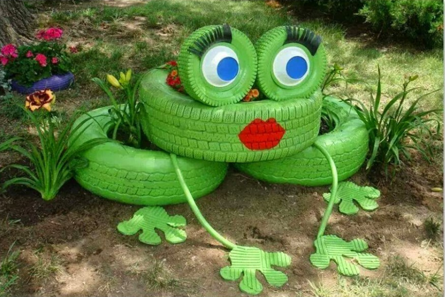 Клумбы и скульптуры в виде животных и сказочных героев. Забавная лягушка из покрышек, добрый гном, таинственный единорог, прекрасные лебеди, трехголовый дракон, черепаха, роскошная карета, огромный телефон ― легче перечислить то, чего не делают из этого доступного материала. Единственное условие ― продумать композицию с самого начала, чтобы не было неприятных сюрпризов потом.