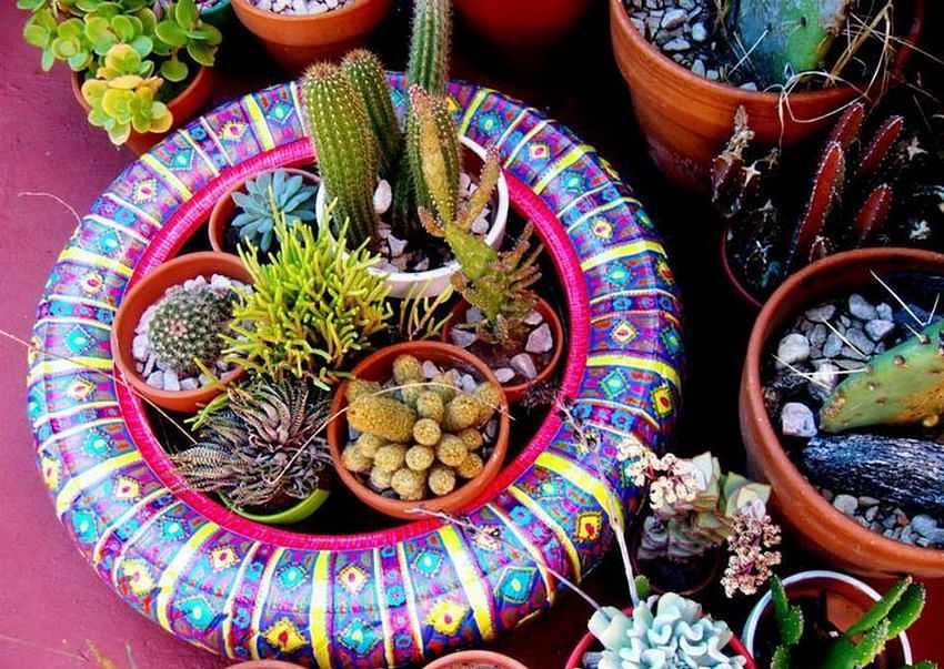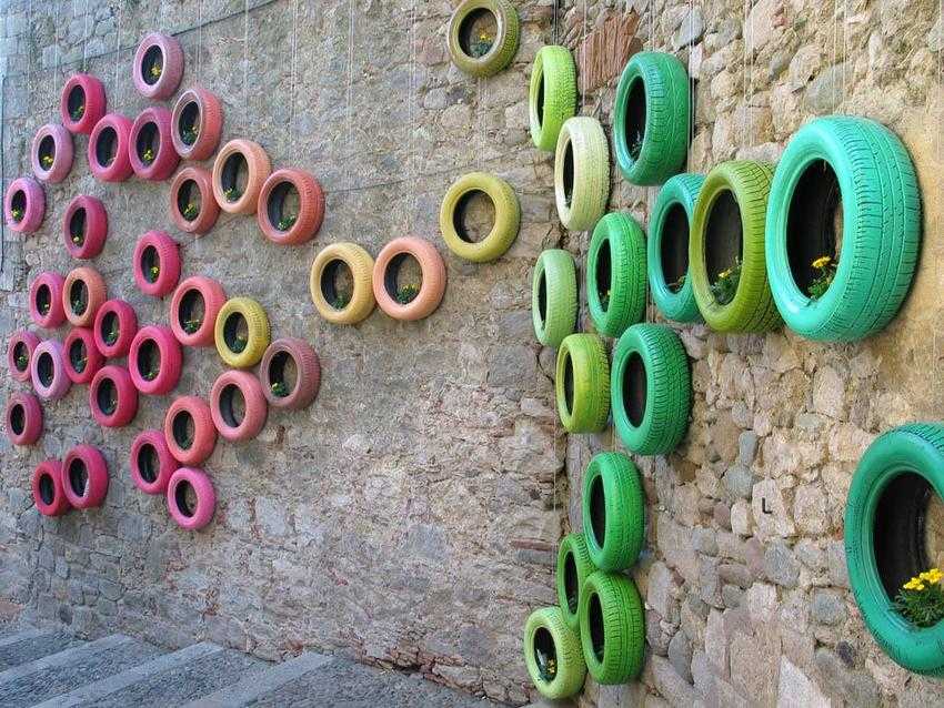 Более простой вариант – использовать покрышку в качестве кашпо или подставки, поместив в неё вазоны в поддонах. Поддоны будут удерживать лишнюю влагу, а сооружение это не такое тяжелое. Такой вариант часто используют на стенах беседок и на верандах.
