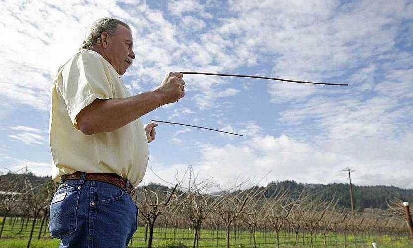 Теперь о том, как ищут воду для колодца с помощью лозы. В качестве индикатора можно использовать участок ветки любого дерева с развилкой, угол которой составляет примерно 150о. Ветку тщательно высушивают на солнце, а затем берут руками за два конца так, чтобы центральная основная часть была направлена вперёд. Затем с таким «прибором» проходят по участку. Близкое залегание водоносных слоёв возможно в тех местах, где ствол наклонится к земле.