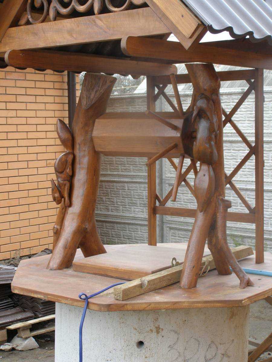 Древесину можно назвать классическим материалом, она подходит как для отделки шахт, так и в качестве основы для оголовка, колодезных столбов, кровли. С его помощью выполняется декоративная отделка, например, резьба, окраска, дополненная рисунком, изображением.