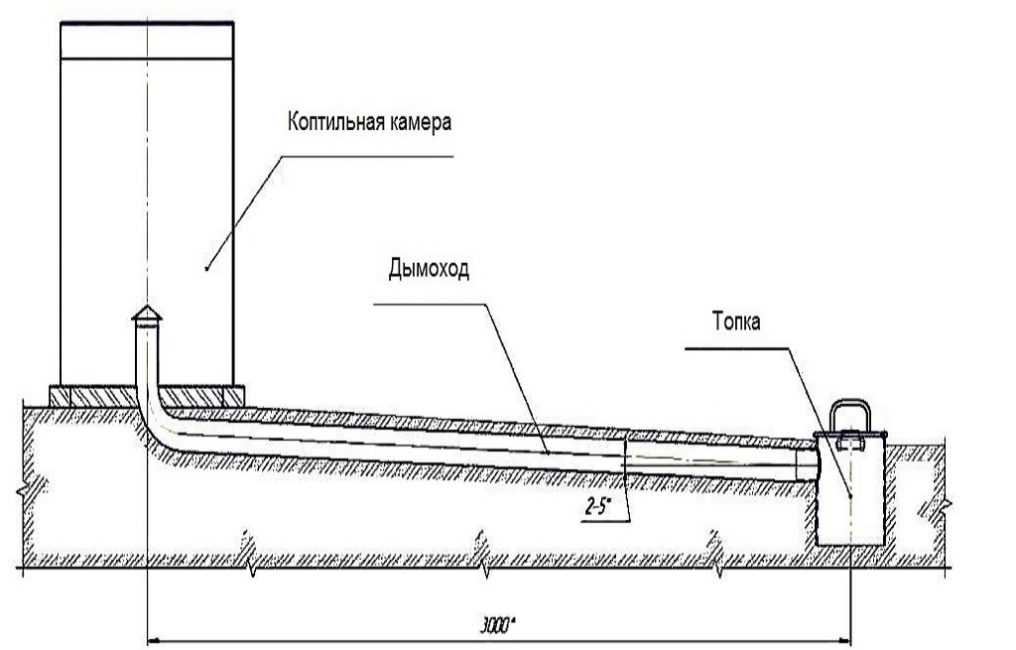● выкопайте шахту для дымохода, ширина которого составляет 0,3 метра, длина — 6 метров; ● заложите трубу, диаметр которой 0,2 метра, в получившийся ров и проведите ее от места нахождения костра до входа в коптильню; ● выложите топку из кирпича или сварите из металла. Её форма должна быть выполнена в форме куба со сторонами 4 метра; ● присоедините топку к трубе; ● установите задвижку на топке с другой стороны, чтобы создать тягу; ● сбейте из досок герметичную камеру для копчения; ● установите внутрь камеры решетки, задвижку, панель для забора продуктов.