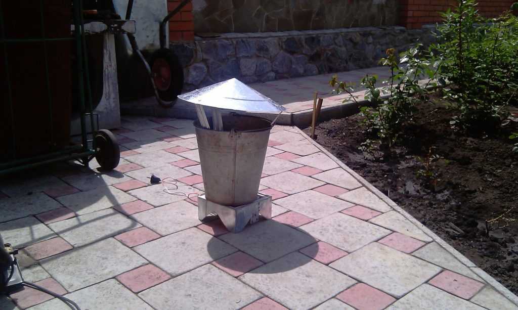 ● на печку поставьте емкость с опилками и накройте ее колпаком;