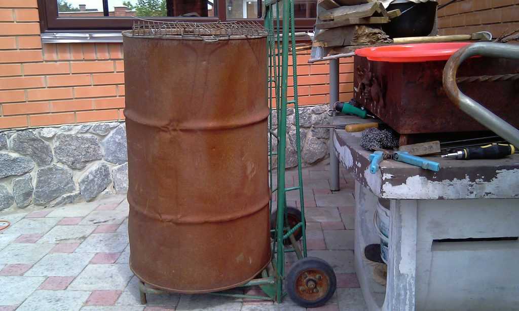 Устройство коптильни из бочки еще проще – в качестве камеры для обработки продуктов используется металлическая или деревянная бочка с вырезанной в боковой поверхности дверкой или съемной крышкой. Полки и ярусы подвесов выполняются так же, как для деревянной или кирпичной камеры.