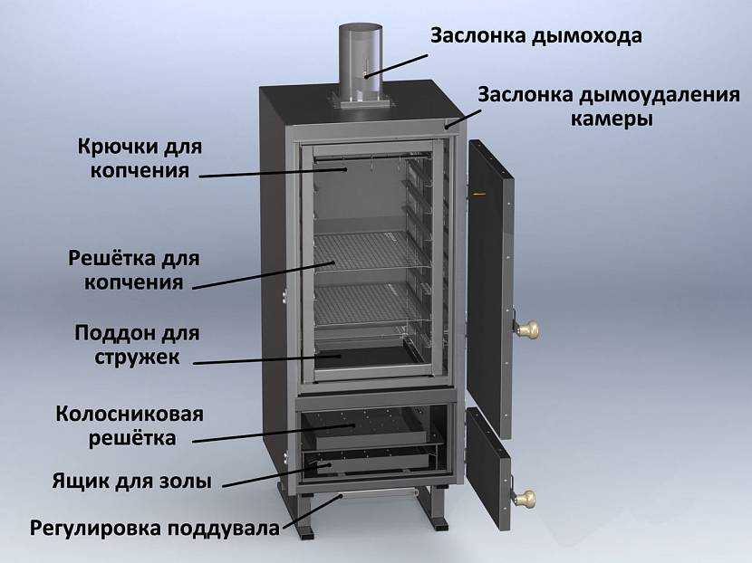 Заслонка дымоотвода из камеры горячего копчения регулирует температуру воздуха в шкафу. Перед зарисовкой чертежа определяют количество продуктов, размер рыбы. Исходя из этих параметров, вымеряют высоту и ширину шкафа. Если предполагается копчение большого количества продуктов, устанавливают несколько рядов решеток и обустраивают крюки для подвеса.