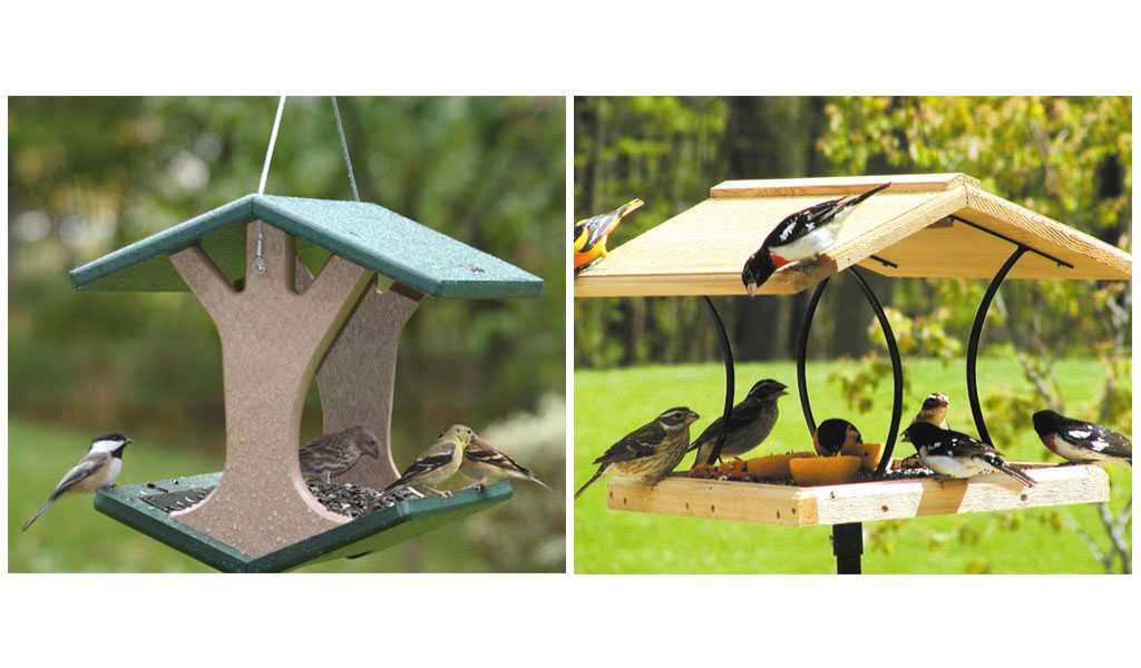 Если устанавливается круглогодичная «столовая», то ее лучше изготовить из дерева или металла, площадка для кормления должна быть достаточно просторной, чтобы вместить всех желающих. В таких кормушках хорошо бы установить на летнее время ещё и поилку.