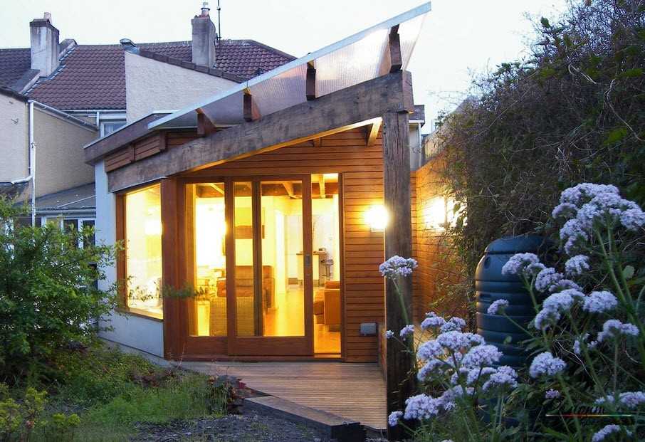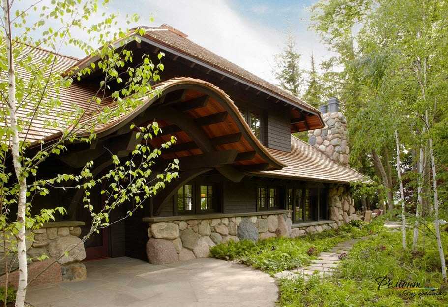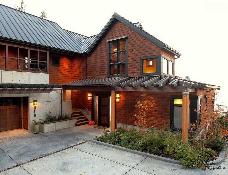 Здесь подразумевается изготовление деревянного каркаса. В качестве кровельного материала может сгодиться тот же поликарбонат, металлочерепица, листовой металл, шифер и т. д. Для домов старого типа такой козырек подходит лучше всего. Кроме того, в числе построек, для экстерьера которых подойдет деревянная конструкция козырька – дома из сруба, реставрированные мазанки и сооружения, выполненные в стиле фахверк.