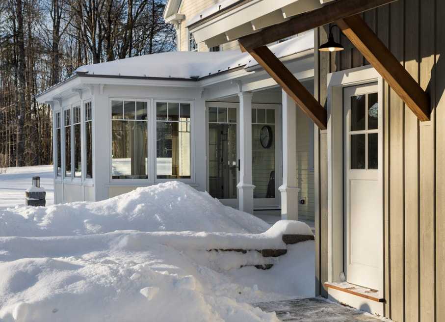 Так выглядит готовая конструкция. Она надежно защитит вход в дом от заметания снегом и проливного дождя.