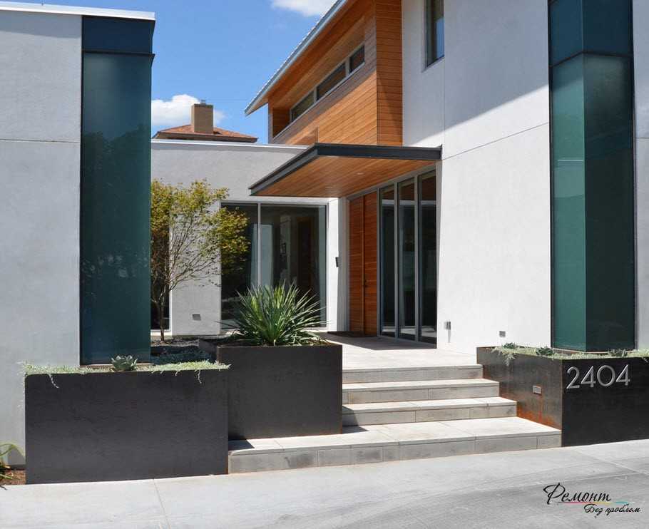 Стекло. Вариант довольно редкий. Козырьки над крыльцом из стекла делают в основном на входе в торговые и офисные здания. Для чего используют специальное толстое, многослойное стекло триплекс, с прочной пленкой между слоями. Она не допустит образования осколков, даже если покрытие разобьется. Этот материал привлекает своей прозрачностью и строгим элегантным видом. Но он довольно тяжелый и дорогой, и требует устройства прочного каркаса со специальными креплениями.