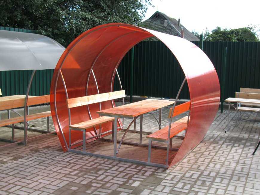 То, что сооружениям из поликарбоната можно придать различные конфигурации, дает возможность воплотить в реальность любую идею. Это может быть простая конструкция из двух лавочек и столиком посредине, с полукруглым покрытием из поликарбоната. Такая мини-беседка из профильной трубы и пластика может быть перенесена в любое место сада или двора.