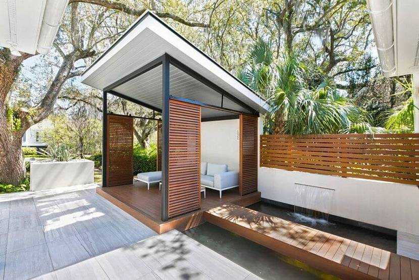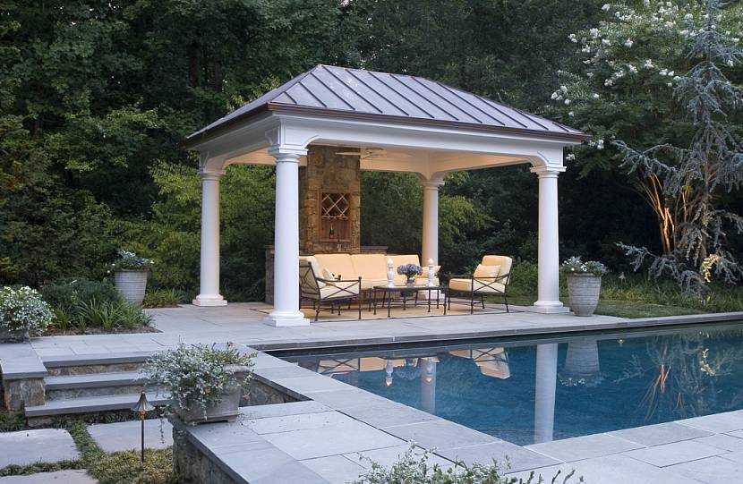 Последний вариант подходит беседкам в восточном стиле. Односкатная и двускатная крыши уместны при небольшом бюджете.