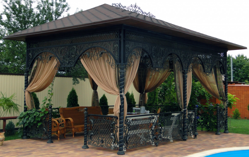 Идеальным сочетанием отличаются кованые конструкции с покрытием из поликарбоната. Они могут быть шестигранной или восьмигранной формы, имея непревзойденный торжественный вид. Такие беседки чаще выполняют, когда нет надобности экономить квадратные метры территории для отдыха.