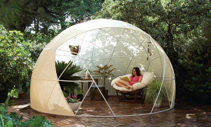 Очень эффектно выглядят беседки, выполненные из профиля и поликарбоната в форме полусферы с раздвигающимися по направляющим дверьми. Такое строение позволяет лицезреть дачный ландшафт с любой стороны. Находясь в уединении, вы в то же время не лишены возможности наблюдать за происходящим вокруг.