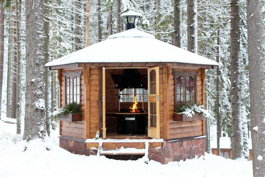 - Для любителей зимних посещений дачи сооружают беседки типа застекленного домика на время обеда шашлыками, которые жарят поблизости.