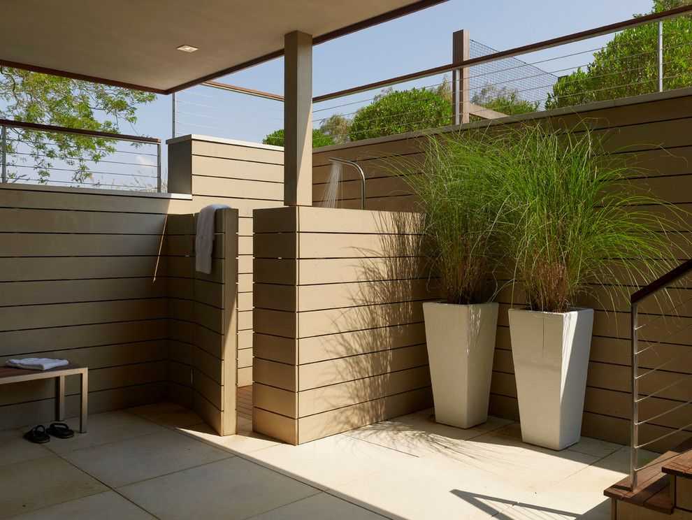 Стандартных размеров для душа нет, их каждый строитель определяет произвольно. Сооружение может быть очень компактным — просто небольшая кабинка со шторкой — или более просторным, с раздевалкой, помещением под обогреватель, местом для умывальника, зеркала, сушки полотенец. Интересны варианты, когда летний душ интегрирован в спа-зону с открытым бассейном, площадкой для принятия солнечных процедур и отдыха.