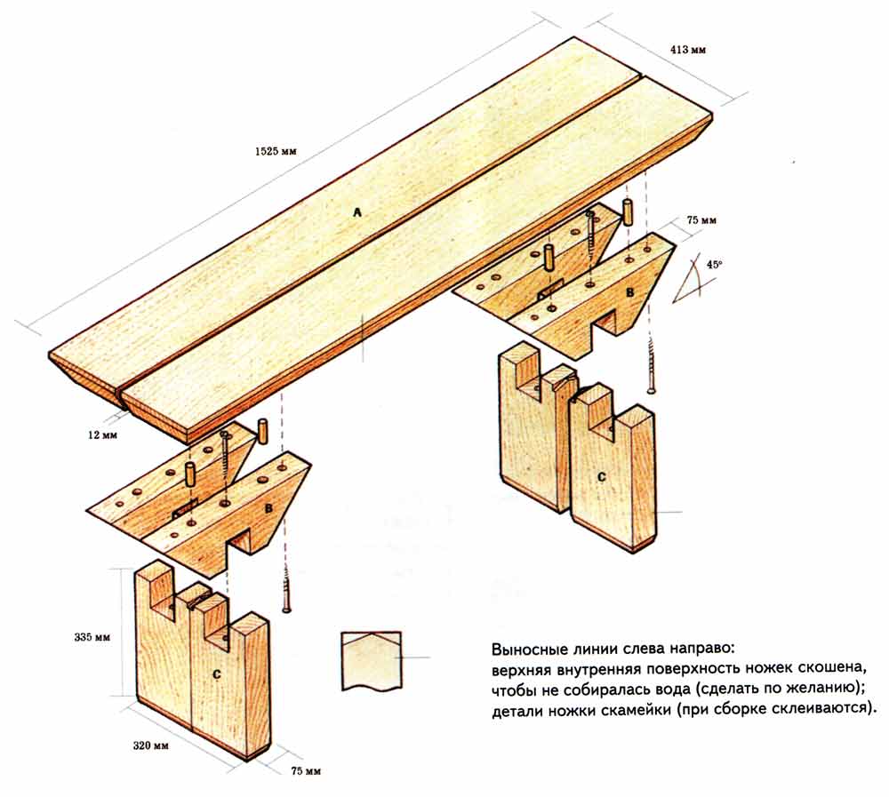 Обратите внимание на то, что вместо бруса для ножек использованы доски, посаженные и на клей, и на саморезы. Соединение ножек с распоркой делается в четверть