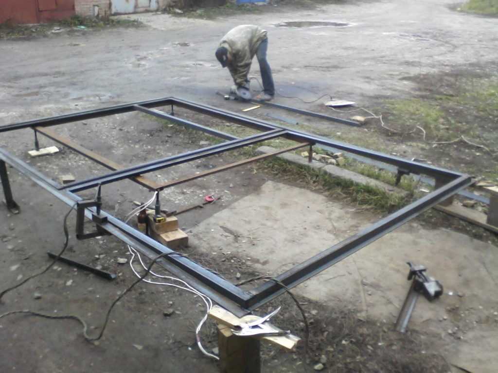 Строительство каркаса. Внешне он напоминает параллелепипед, стенки которого укреплены дополнительными стойками. Со стороны, где будут располагаться ворота, сооружают своеобразный внутренний каркас под эти конструкции. Соединяются между собой трубы с помощью сварки. Если не сварить профиль, а скрепить между собой болтами, тогда со временем появятся небольшие колебания и конструкция не будет такой прочной.