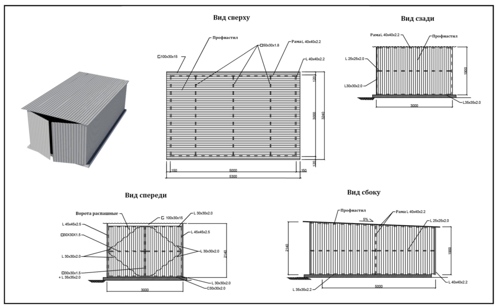 Перед началом строительства Вы создаете наглядный эскиз будущей постройки на листе бумаги или в программе Автокад на компьютере. Это в первую очередь нужно для предварительного подсчета количества материалов и определения размеров гаражного бокса. Для создания подробного фото гаража из профнастила понадобиться высота, длина и ширина конструкции, материал отделки и выбор цветового решения.