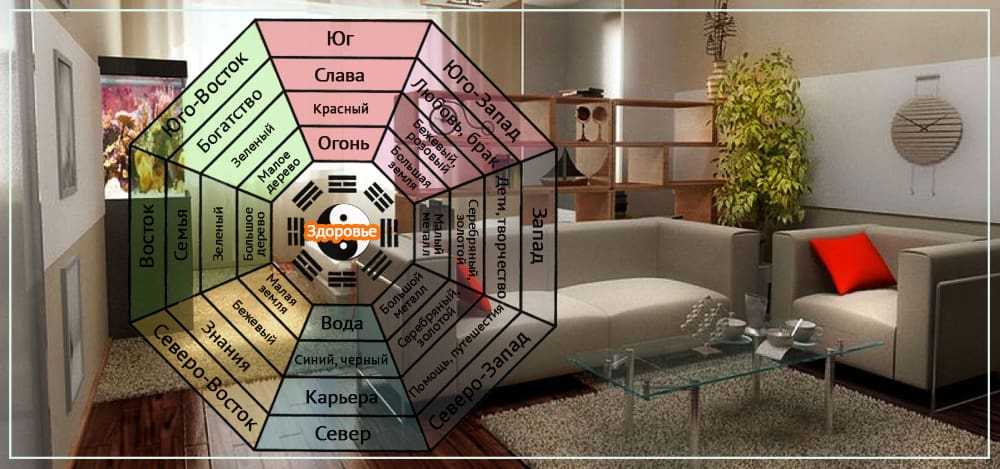 В квартире по фэн-шуй за денежный сектор отвечают деревянные элементы. Подходящие цвета – золотой, лиловый, зеленый. Чтобы активировать эту зону, ее необходимо питать водой. Для этого тут размещают аквариум, устанавливают фонтанчик, организовывают хорошее освещение.