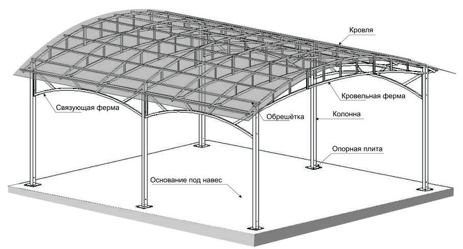 Навесы отличаются друг от друга по форме кровли и месту расположения. Конструктивно покрытия разделяют на разные типы.