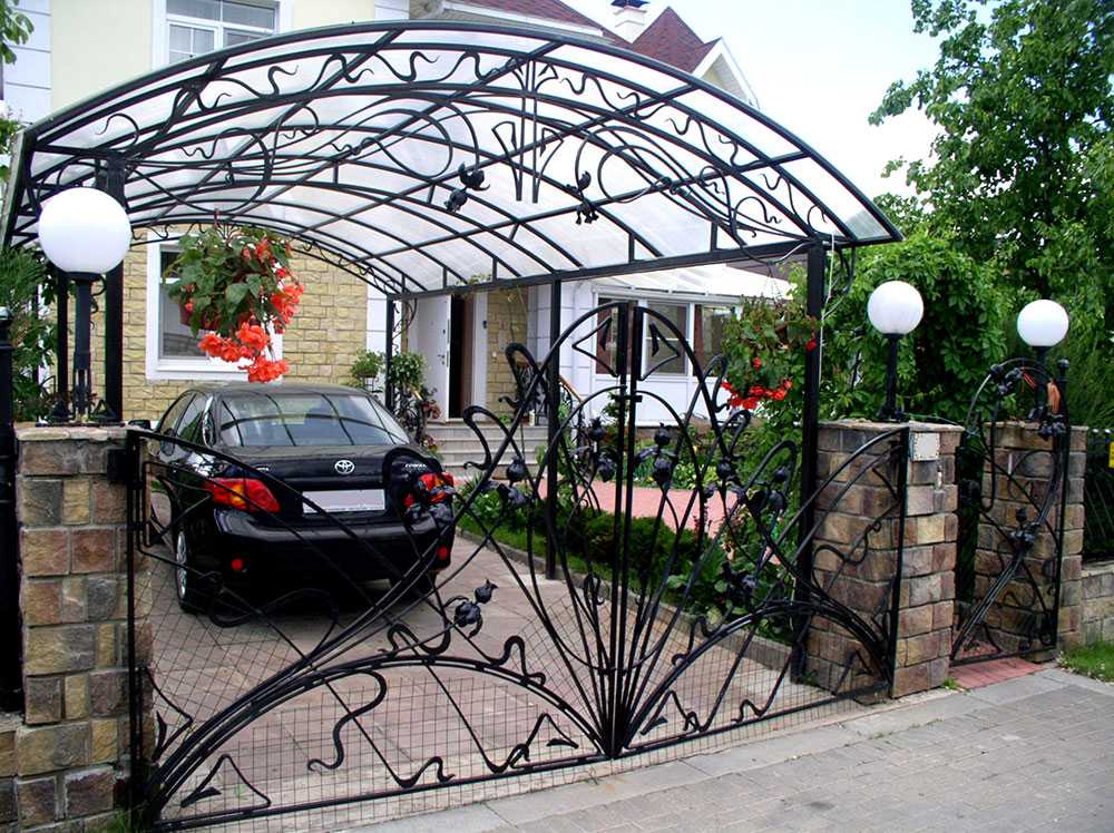 Навесная конструкция декорируется по своему усмотрению, но так, чтобы украшения не мешали въезду-выезду автомобиля. Для металлического, кирпичного сооружения оптимально подойдут изящные кованые детали (перила, карнизы), растения в кашпо, расположенные под самой крышей, светодиодная подсветка, гирлянда. Выполненное из дерева – оформляется резьбой, тонируется под элитные породы, расписывается узорами вручную. Допускается монтаж перил из точеных деревянных балясин, ажурных декоративных решеток.