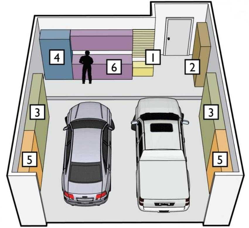 Оптимальная организация системы хранения в гараже: 1 — открытые кронштейны и крючки для часто используемых инструментов, 2 — стеллаж для мелких инструментов, 3 — полки для запчастей и шин, 4 — стеллаж для крупных инструментов, 5 — шкафы для различных вещей, 6 — верстак с дополнительными полками