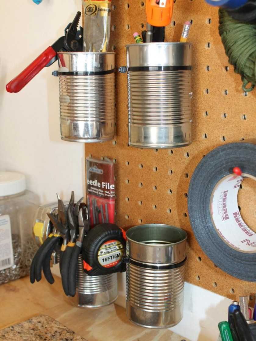Если в гараже скапливаются мелкие вещи, для хранения подобных предметов подойдут пластиковые органайзеры. Последние можно приобрести в магазине либо сделать самостоятельно, вырезав часть пластиковой канистры.