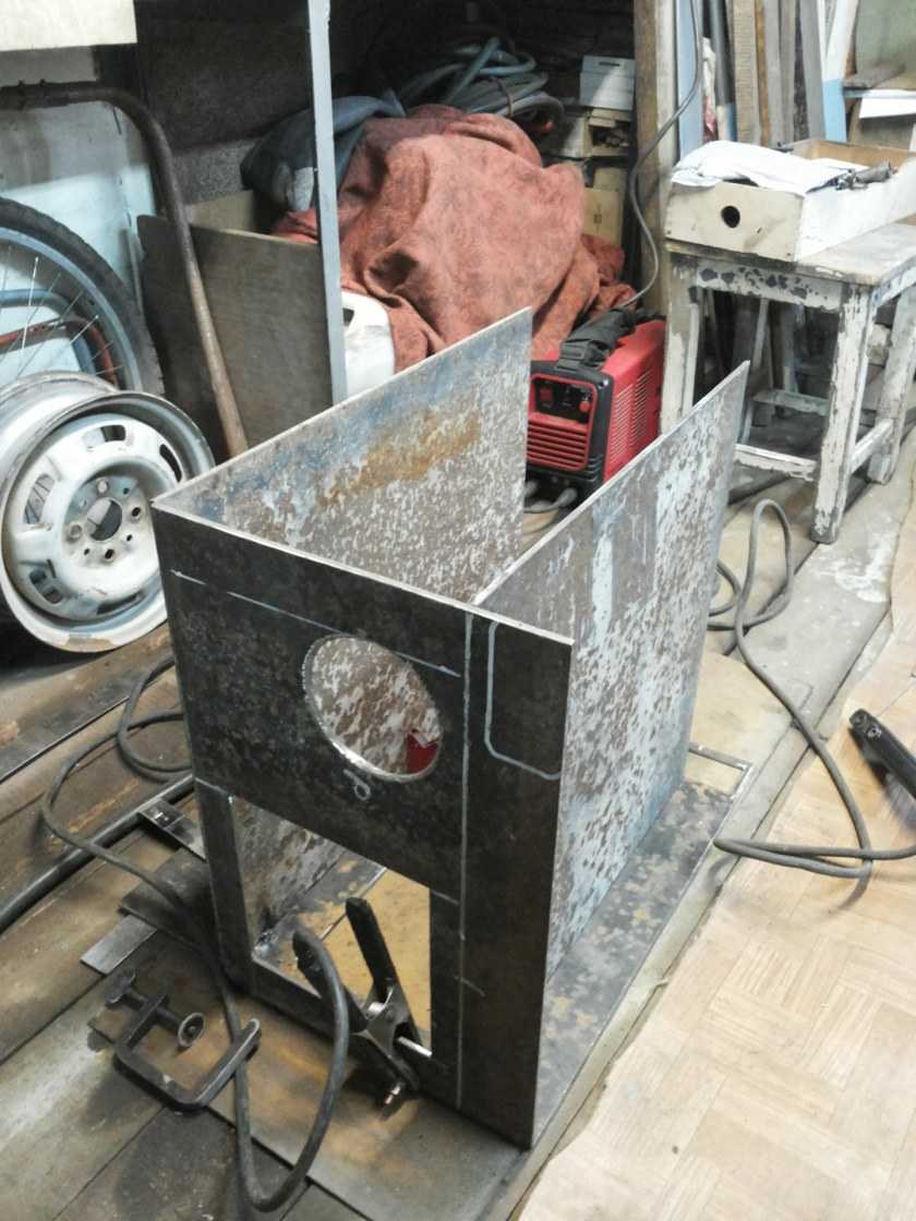 В корпусе делают отверстие под дымник, приваривают его, выводят за пределы гаража. Колосники варят сами или берут готовые. Поддувало выполняют в нижней области печки, ставят заслонку.