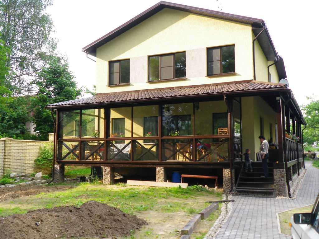 Застеклить веранду безрамным способом невозможно, если планируется постройка второго этажа над ней. Здесь, главное, правильно просчитать нагрузки здания и достаточную способность рамной конструкции выдерживать большой вес. Этот тип хорошо подходит для создания веранды на втором этаже.