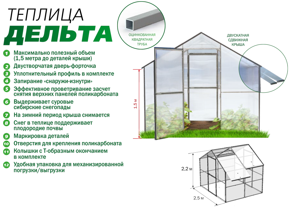 Достоинства: Комплектуется поликарбонатом «Премиум» класса 4 мм. плотностью 0,7 кг/м2 с эффективной защитой от УФ на поверхности, срок службы 15-20 лет. Ширина раздвигающегося листа поликарбоната 1 метр, по желанию может быть уменьшена до 50 или 70 сантиметров. Каркас не ржавеет, изготовлен из оцинкованной квадратной трубы. Конструкция позволяет установить автоматические форточки. Недорогие, ремонтопригодные направляющие из поликарбоната с УФ защитой. Разборная, удобная для транспортировки.