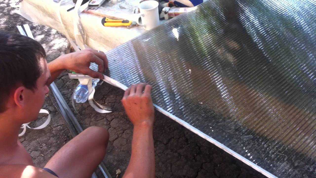 После подготовки всех элементов конструкции стоит дополнительно обработать торцы поликарбоната. Чтобы предотвратить проникновение пыли и влаги, один из торцов следует аккуратно проклеить герметизирующей лентой. Если этого не сделать, полимер может преждевременно потемнеть, что отрицательно скажется на количестве солнечного света, получаемого растениями. Противоположный торец лучше проклеить перфорированной лентой. Это поможет избежать образования конденсата, а также эффективно защитит от попадания пыли и мусора.