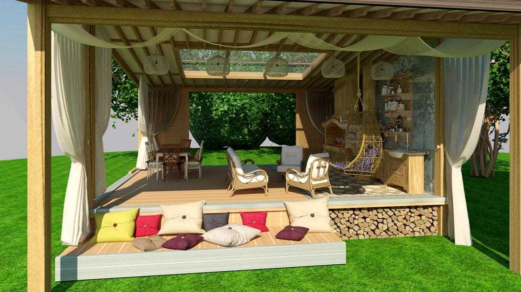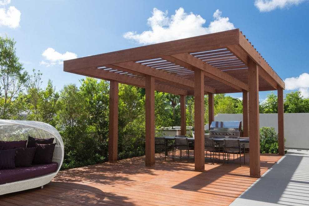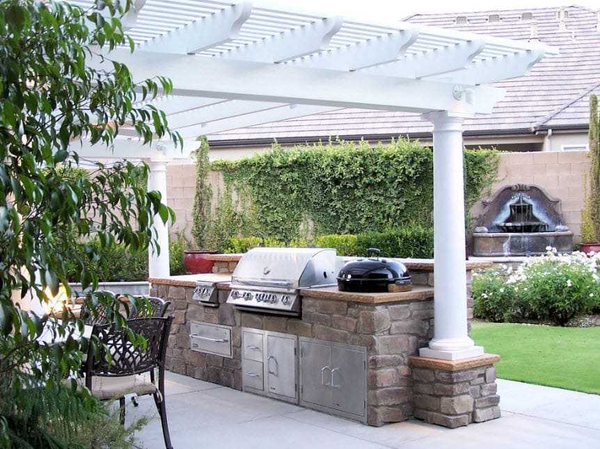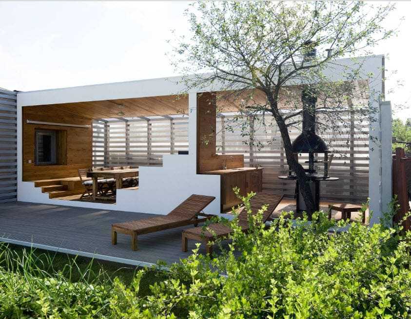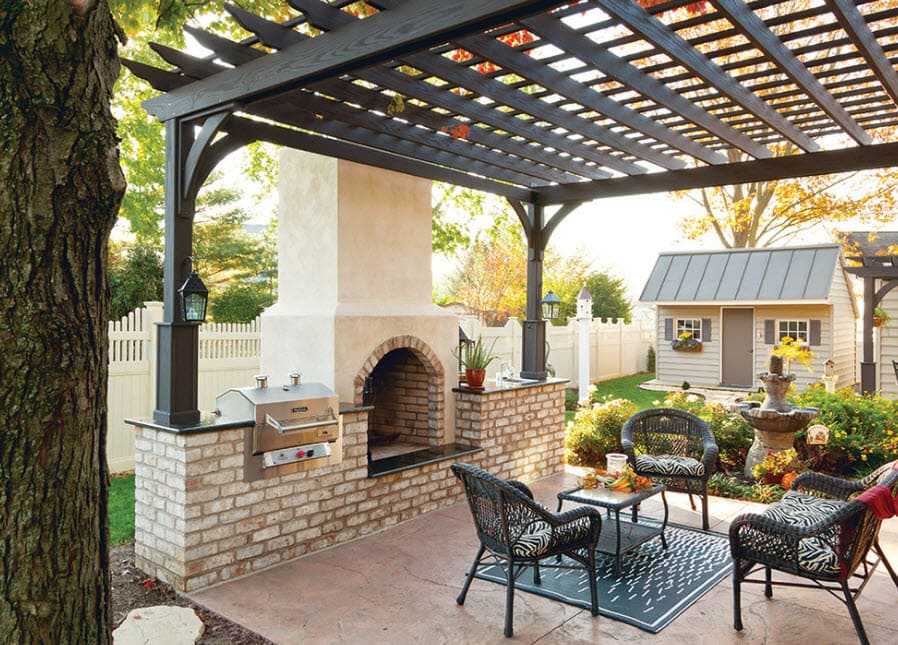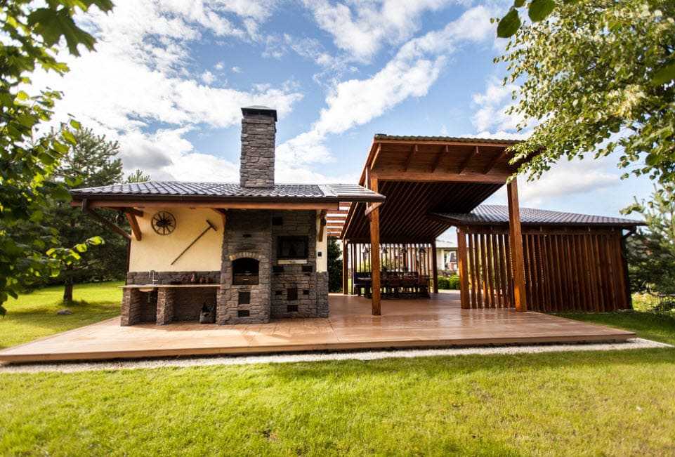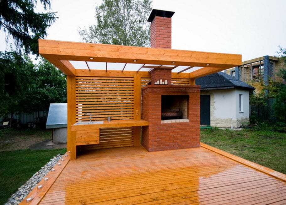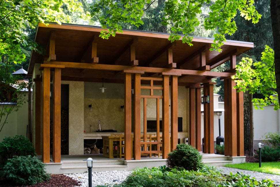Лаконичный, но в тоже время не менее функциональный вариант – обустройство перголы. Пергола – это беседка в виде арки из бруса с крышей в виде решетчатого перекрытия. Печь выступает одной из стен постройки, оснащается шкафом для посуды, мойкой и разделочной поверхностью. Остальные стены украшаются решеткой или плетущимися растениями.