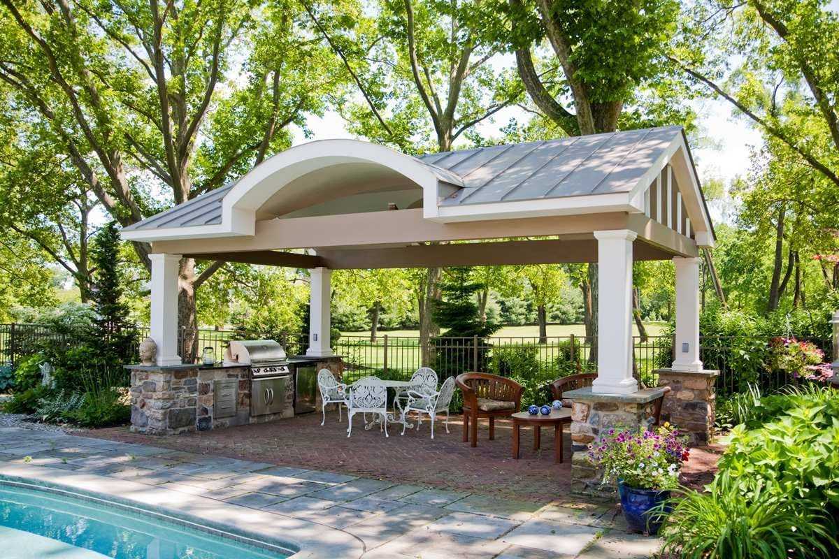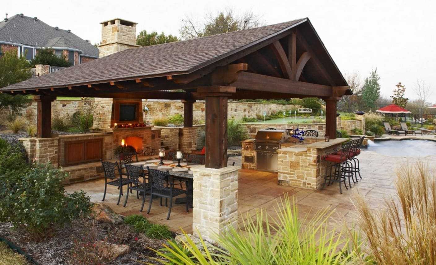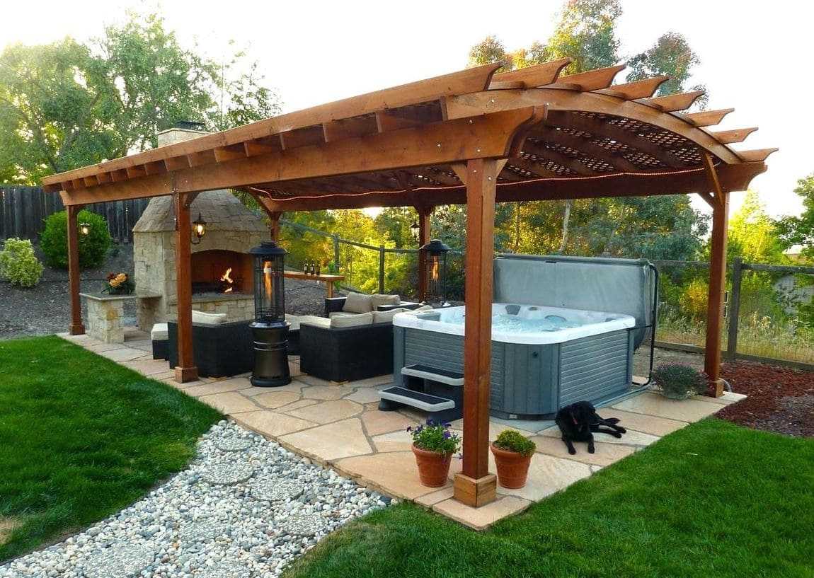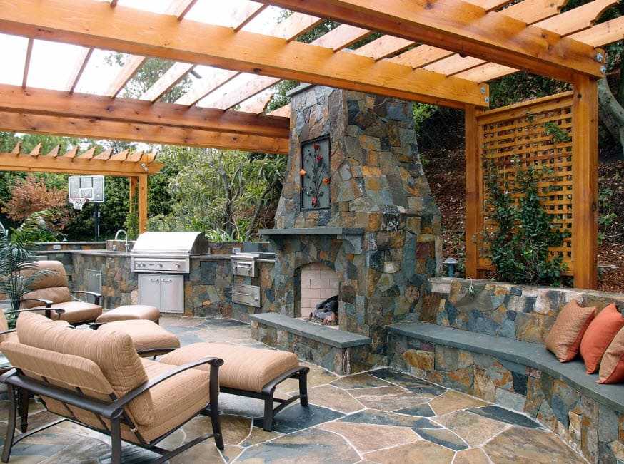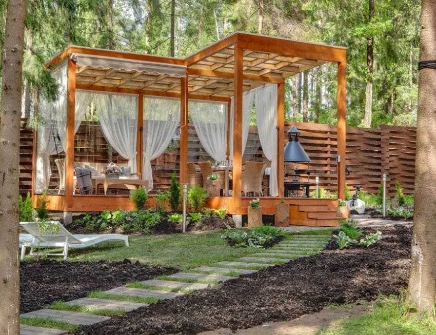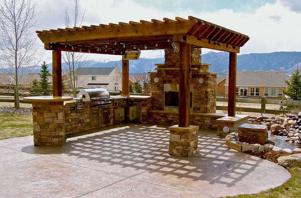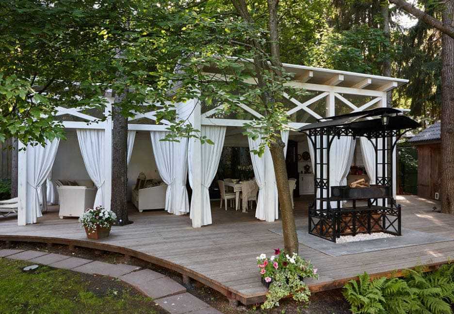 Лаконичный, но в тоже время не менее функциональный вариант – обустройство перголы. Пергола – это беседка в виде арки из бруса с крышей в виде решетчатого перекрытия. Печь выступает одной из стен постройки, оснащается шкафом для посуды, мойкой и разделочной поверхностью. Остальные стены украшаются решеткой или плетущимися растениями.