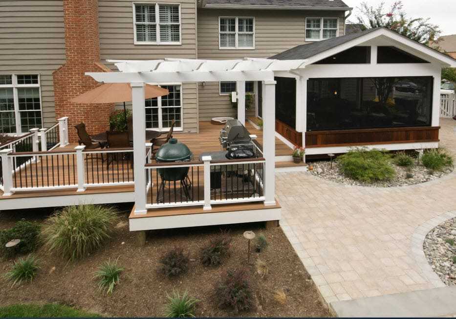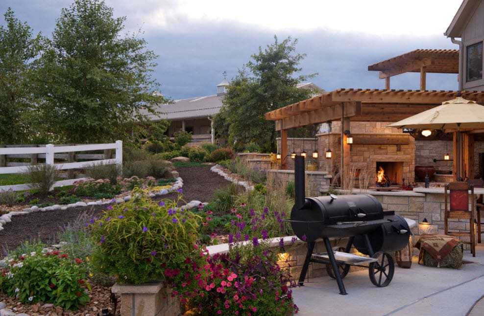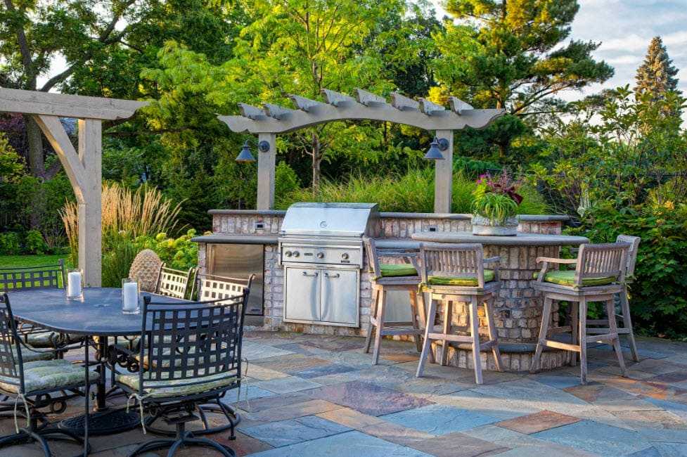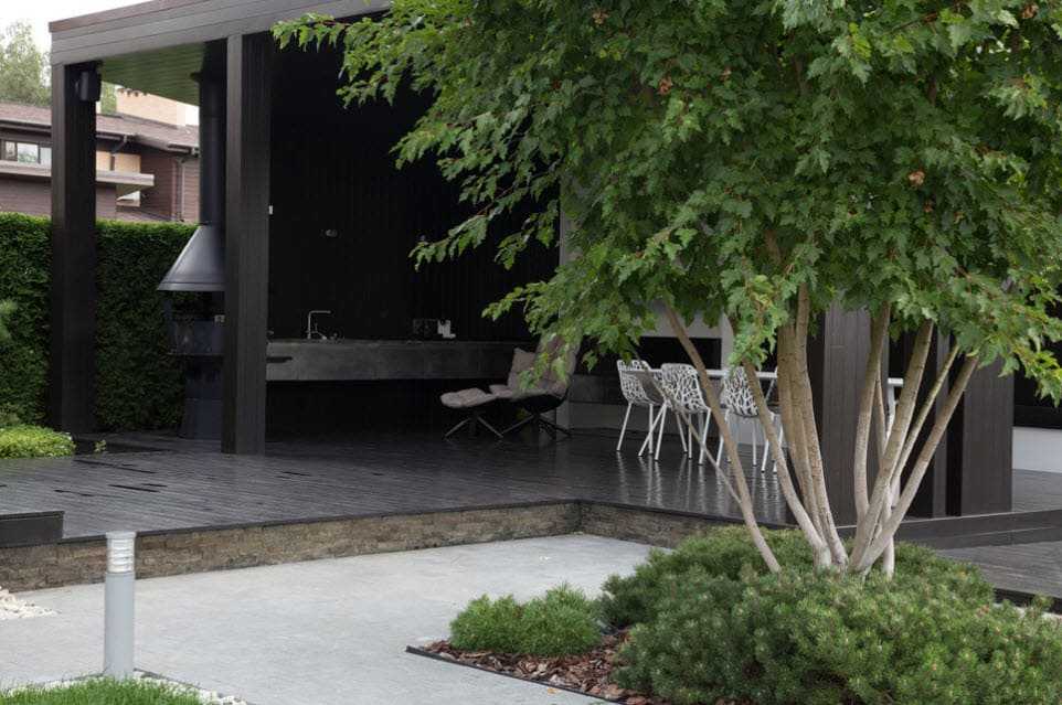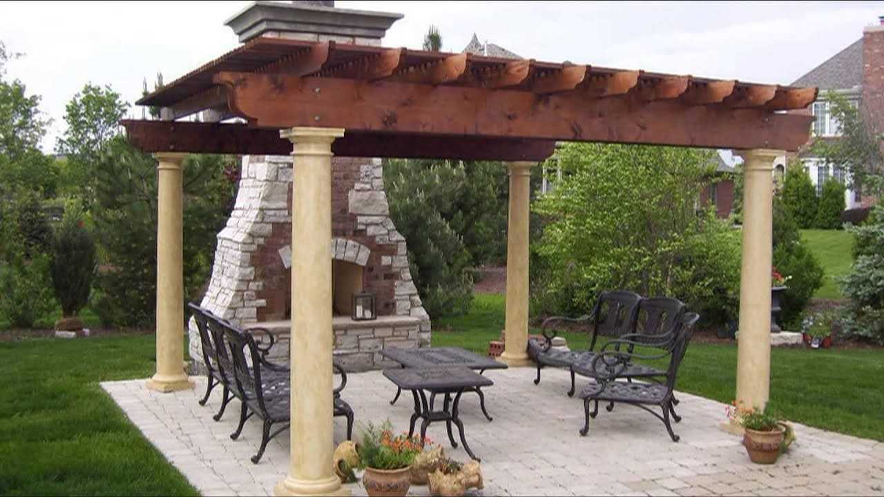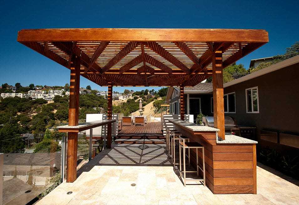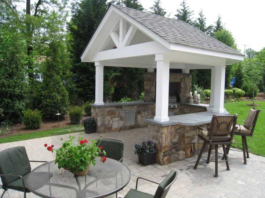 Лаконичный, но в тоже время не менее функциональный вариант – обустройство перголы. Пергола – это беседка в виде арки из бруса с крышей в виде решетчатого перекрытия. Печь выступает одной из стен постройки, оснащается шкафом для посуды, мойкой и разделочной поверхностью. Остальные стены украшаются решеткой или плетущимися растениями.