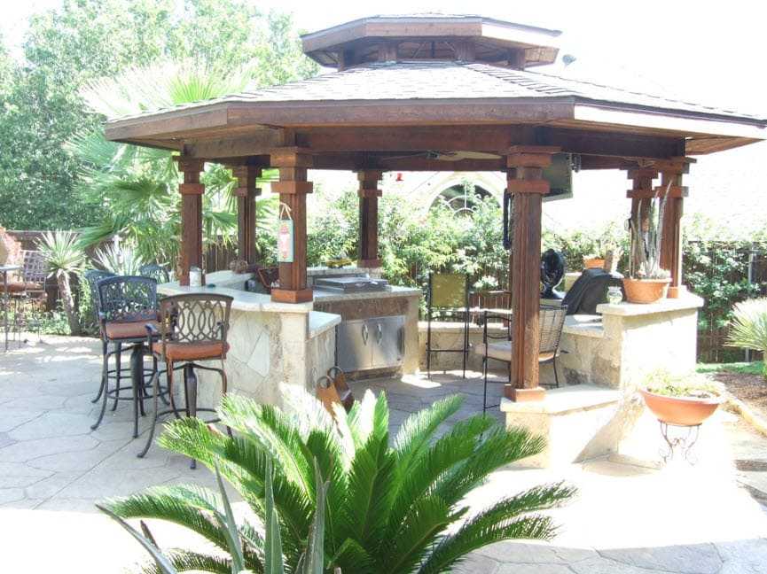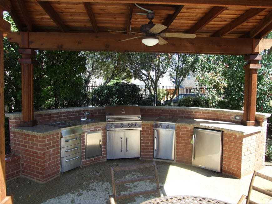 Стационарная конструкция предполагает обязательную защиту пламени от осадков и ветра. Крытое устройство способствует длительной сохранности жара. Уличные барбекю выполняют из металла. Корпус стационарной печки может быть изготовлен из кирпича с высокими огнеупорными характеристиками. В беседках нередко размещают стационарные комплексы, которые включают печное оборудование, канализационные системы, мойку, мебель, столы (все, что может пригодиться для готовки на улице).
