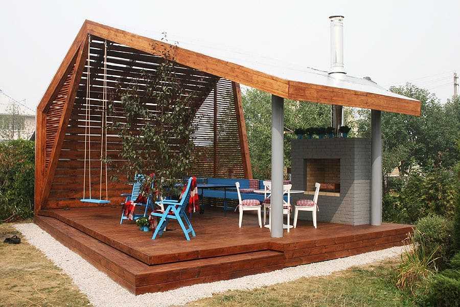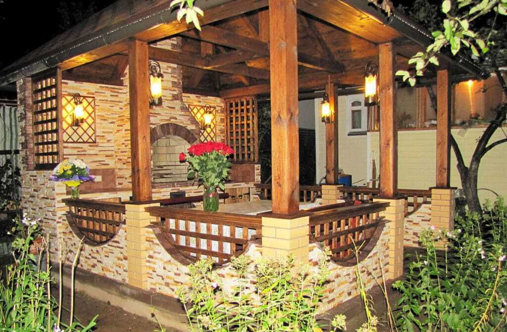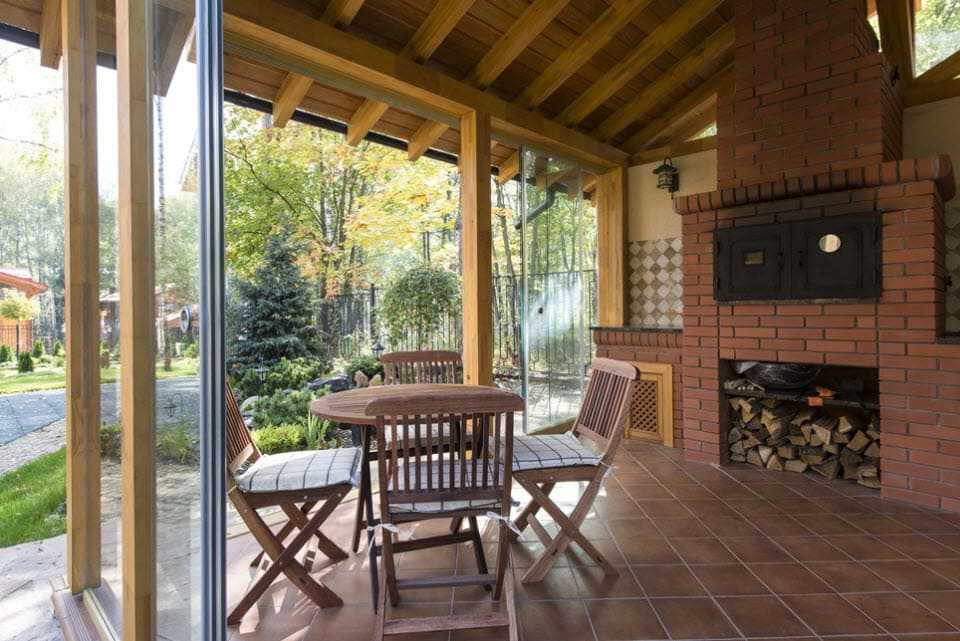 Беседки с печками могут иметь различные конструктивные особенности. Основным материалом изготовления бывает кирпич, камень, дерево. Своими руками можно построить закрытый домик с окнами и дверью или оборудовать печью открытую террасу.