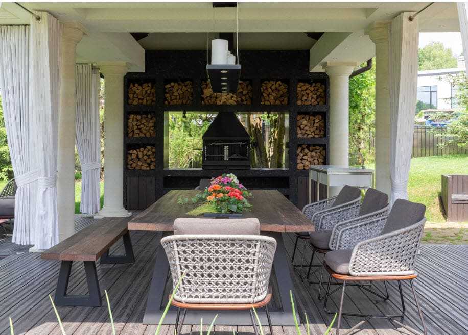 Большинство современных печей для беседок оборудованы разделочным столом, который сконструирован непосредственно справа от топки. При оформлении полноценного кулинарного комплекса используется правило «рабочего треугольника», облегчающего путь хозяев от места хранения сырых продуктов к подаче готового блюда для гостей. В целом, разделочный стол по своим характеристикам не отличается от рабочей поверхности кухни. Для столешницы используют покрытия из дерева, металла, искусственного камня и ДСП. Оптимальный вариант – плитка или керамогранит, устойчивый к перепадам температуры и очень лёгкий в уходе.