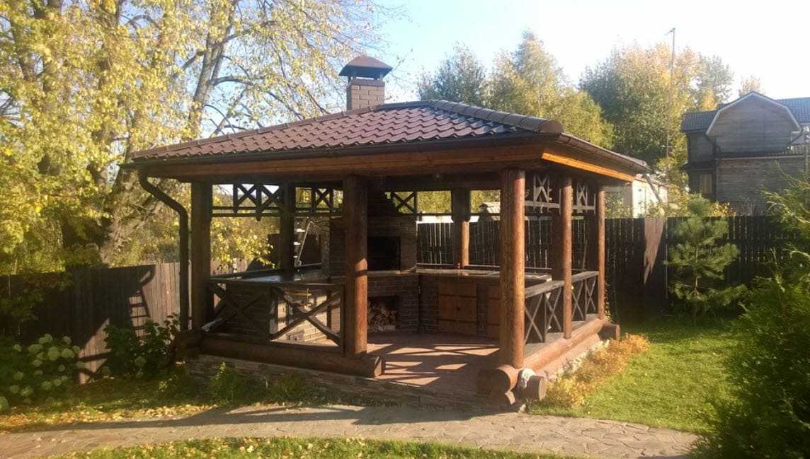 - Рубленые беседки — из оцилиндрованных бревен, применяется для основательного массивного проекта с площадью не меньше 10 квадратных метров.