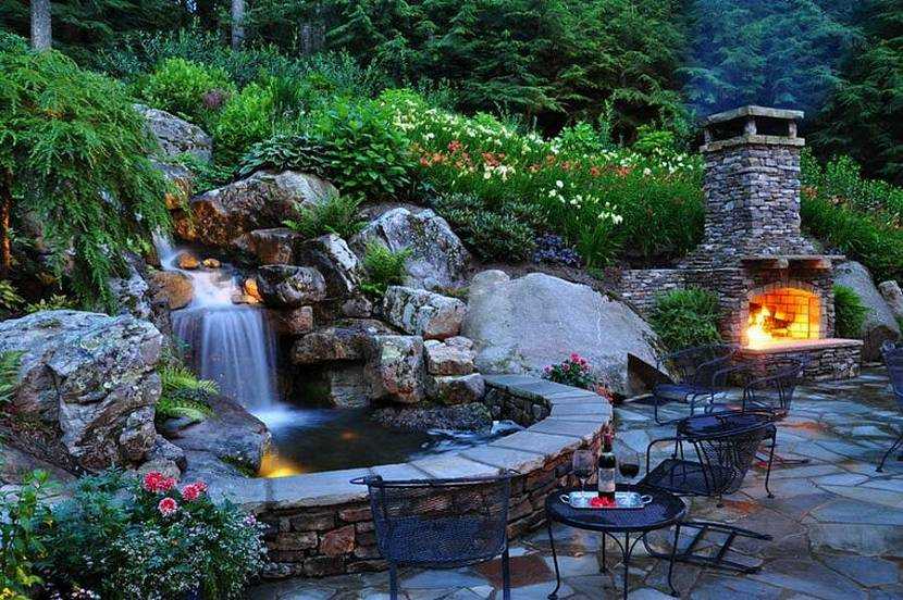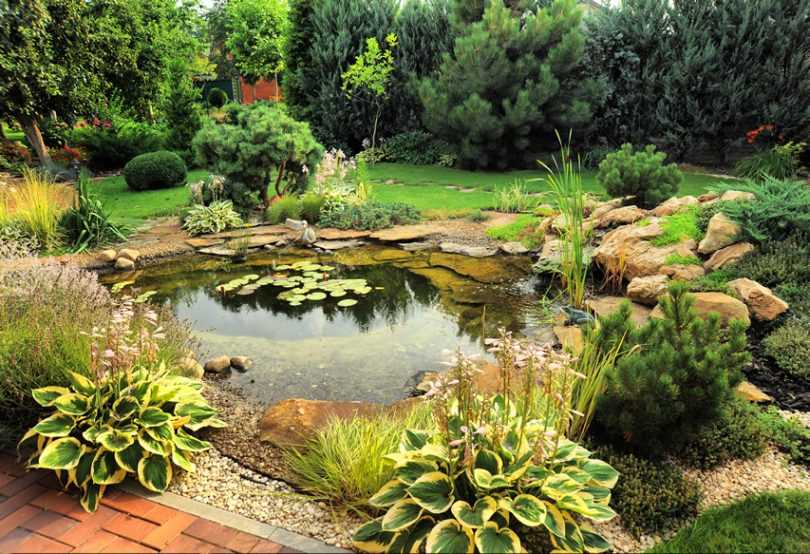 Центром вашего сада может стать искусственный водоем, декорированный натуральными камнями и прибрежной растительностью. Искусственный водоем не только украсит ваш сад, но и позволит создать мягкий микроклимат, привлечет пернатых друзей. Птицы с удовольствием будут прилетать к импровизированному пруду, чтоб напиться во время жаркого летнего дня.