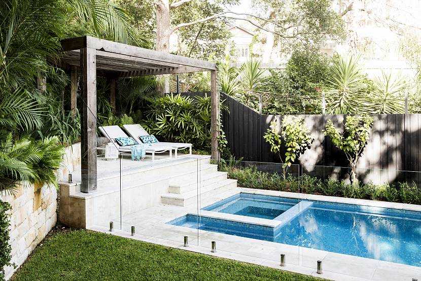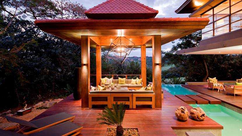 Маленькая зона отдыха из натурального дерева возле бассейна в тайском стилеИсточник growingrooms.com.au