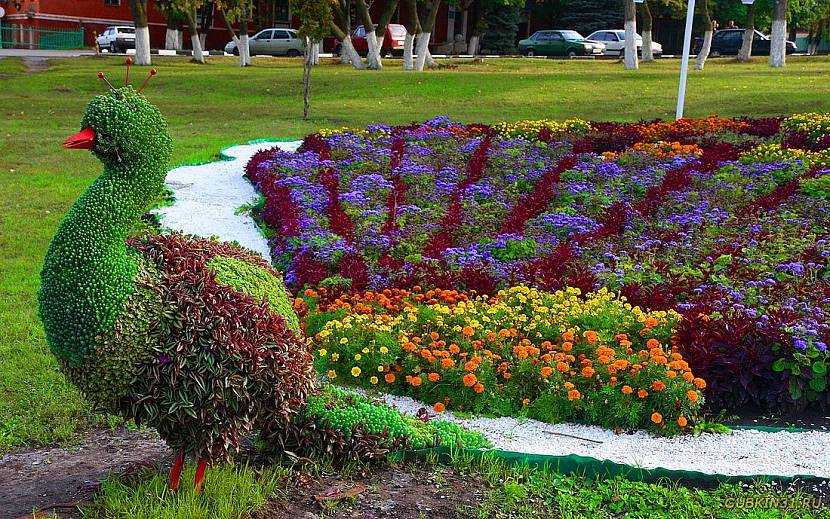Арабеска – это сложные узоры и орнаменты, стилизованные под средневековье. Сложные витиеватые изгибы цветника образуют геометрические фигуры, орнаменты, извилистые линии. Арабески часто имитируют фигуры животных, птиц и растений. Чтобы персонаж смотрелся ярко и красочно, его контуры обрамляют несколькими кругами цветов сочных расцветок.