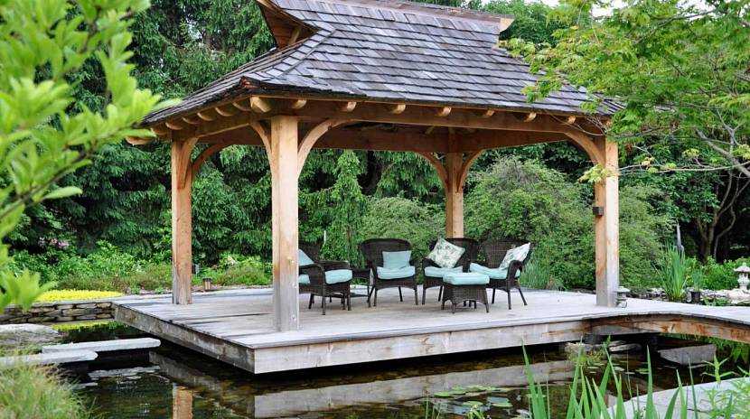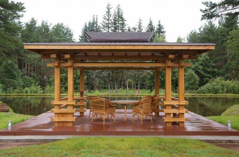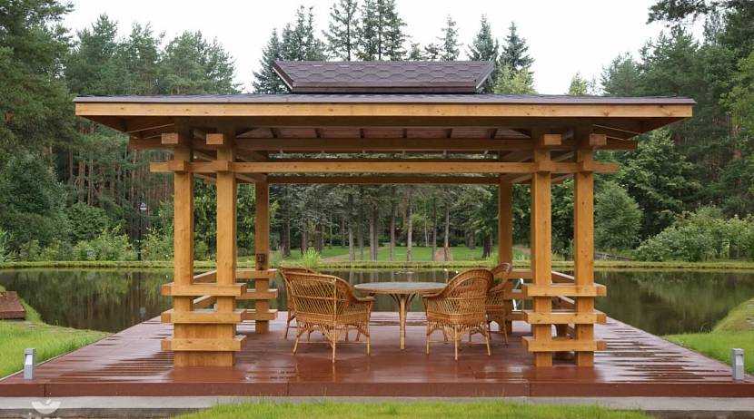 - Цветовая гамма также природная, нейтральная – все должно говорить о сдержанном благородстве строения. Природный рисунок древесины – главное украшение беседки.