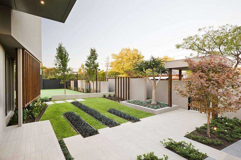 Палисадник с геометричными клумбами, широкой дорожкой и серым заборомИсточник decorits.com