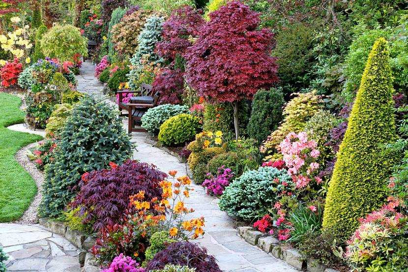 — оформление дорожек по периметру большими размашистыми клумбами;