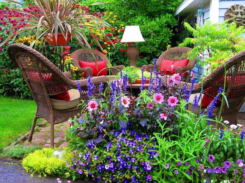 На маленькой площади лучше всего организовать цветущие клумбы по периметру дома, террасы, вдоль забора и вокруг любых других сооружений. А все незанятые территории просто засадите газоном или смесью газонных трав.
