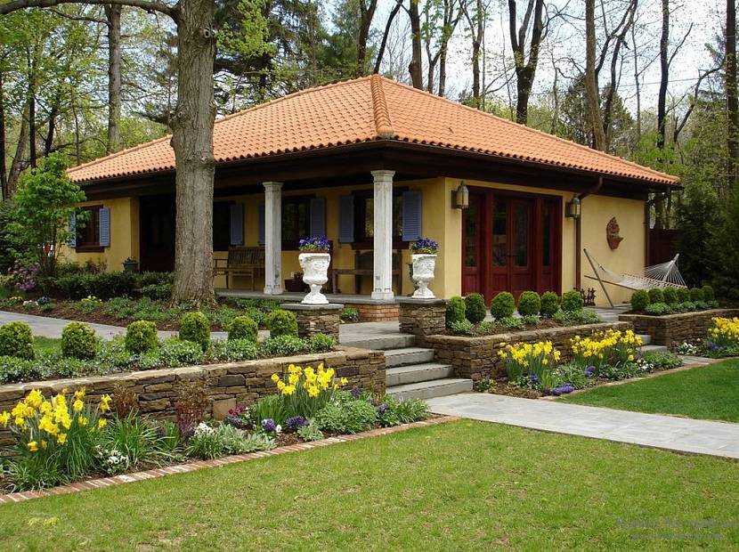 - Цветники рядом с домом должны по оттенку совпадать со стенами сооружения.