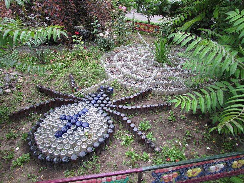 Часто используются специальные дизайнерские приемы: декорирование клумб гравием, камнями, деревом. Также нередко владельцы проявляют фантазию и в ход идут подручные материалы (автомобильные покрышки, кованые элементы, бутылки, тележки, цветочные горшки). Из сарая выходят на свет садовые фигуры, механизмы и старинная утварь. Дизайнеры находят применение даже потертому ботинку.