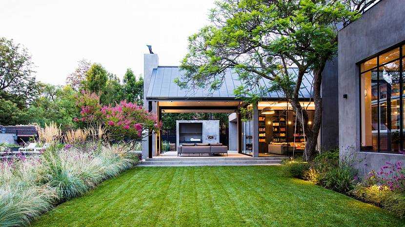 Большой сад с газонными полянами и длинным бассейном оттенка «стратосфера»Источник roomble.com