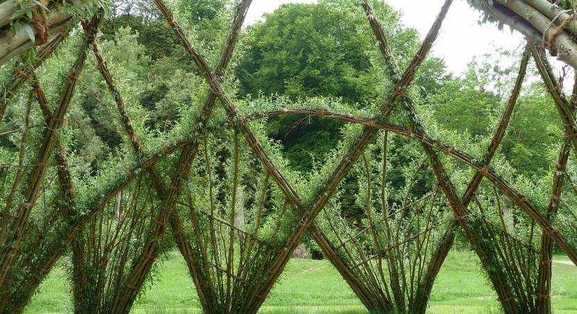 Такая комната отдыха под открытым небом – настоящий арт-объект и полноценный рукотворный элемент ландшафтного дизайна. В такой беседке нет стен, пола и крыши – только растения. Стены из стволов, навес – из ветвей и листьев. Правда, в отличие от возводимой из любого материала конструкции, эта станет готова к эксплуатации через несколько лет. Деревья должны набрать силу, листья – стать больше, чтобы во время дождя внутрь не просочилась ни одна капля.
