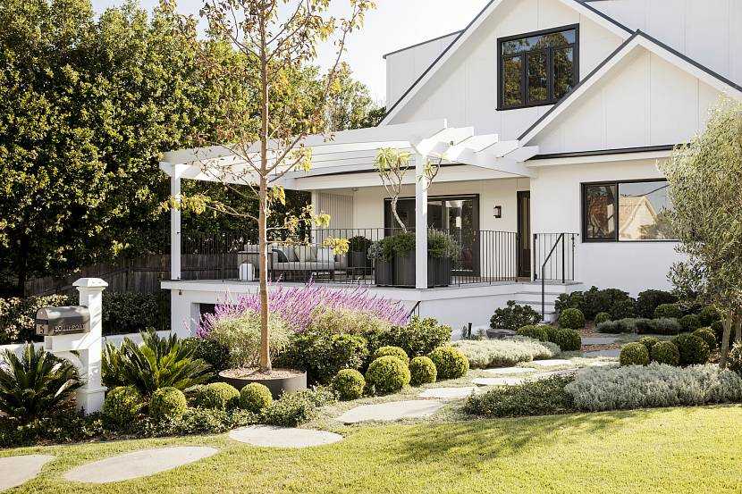 Красивый палисадник с крыльцом и комбинированными посадками кустарников и многолетниковИсточник kuhni-prosha.ru